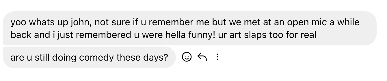 I was thinking about what to write about for this post and thought it might be convenient to talk about my experiences with stand-up comedy. I say convenient because it gives me something to write about, but also because people be asking me “Do you still do comedy? Why did you stop?” and instead of saying the same ol’ thing, maybe I can just send them this post. Someone recently reached out to me via instagram DM to ask me about this very topic: